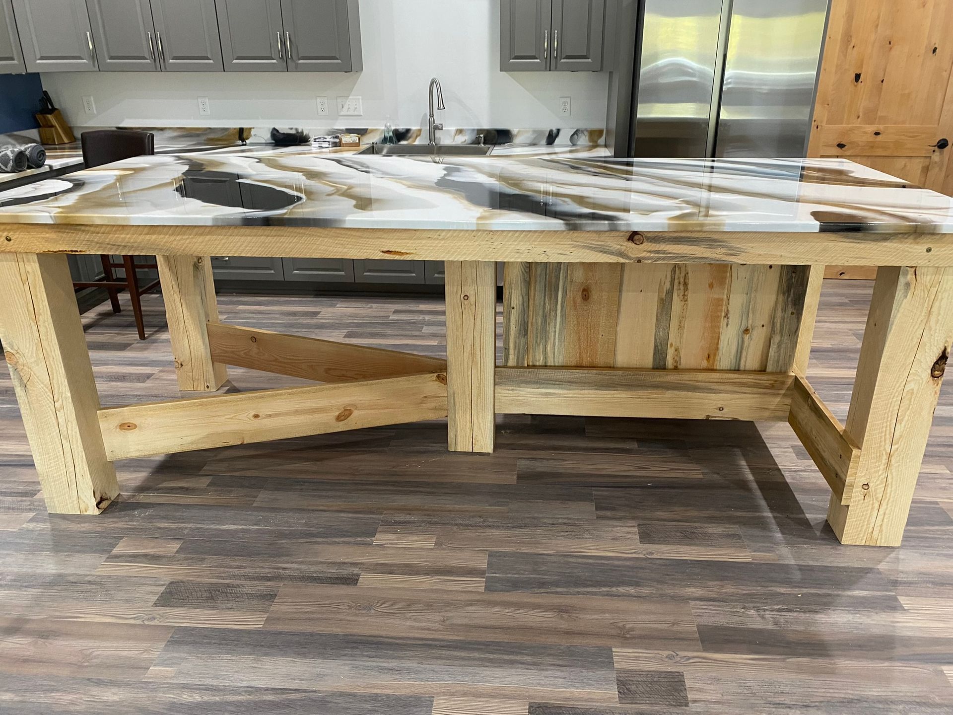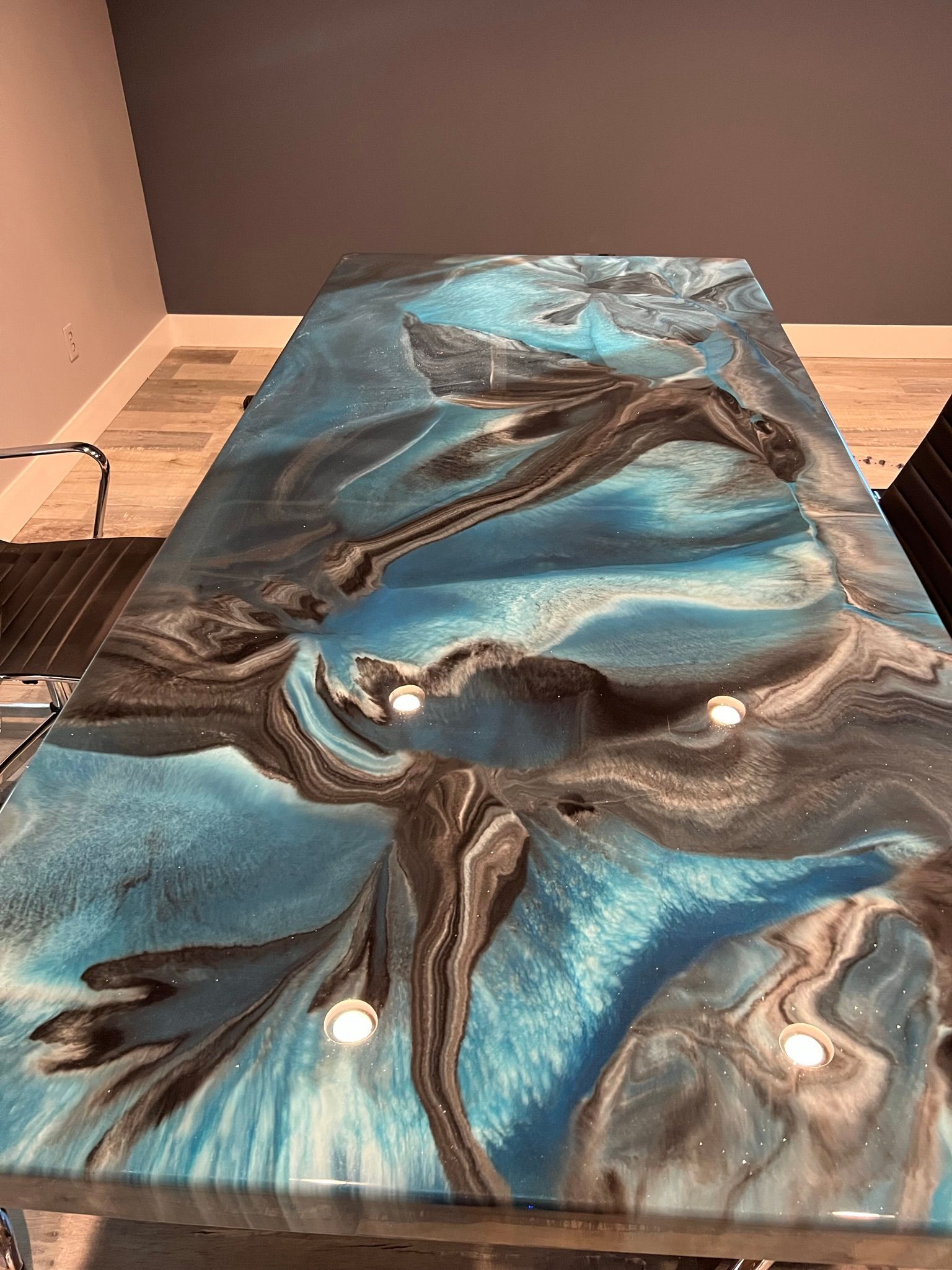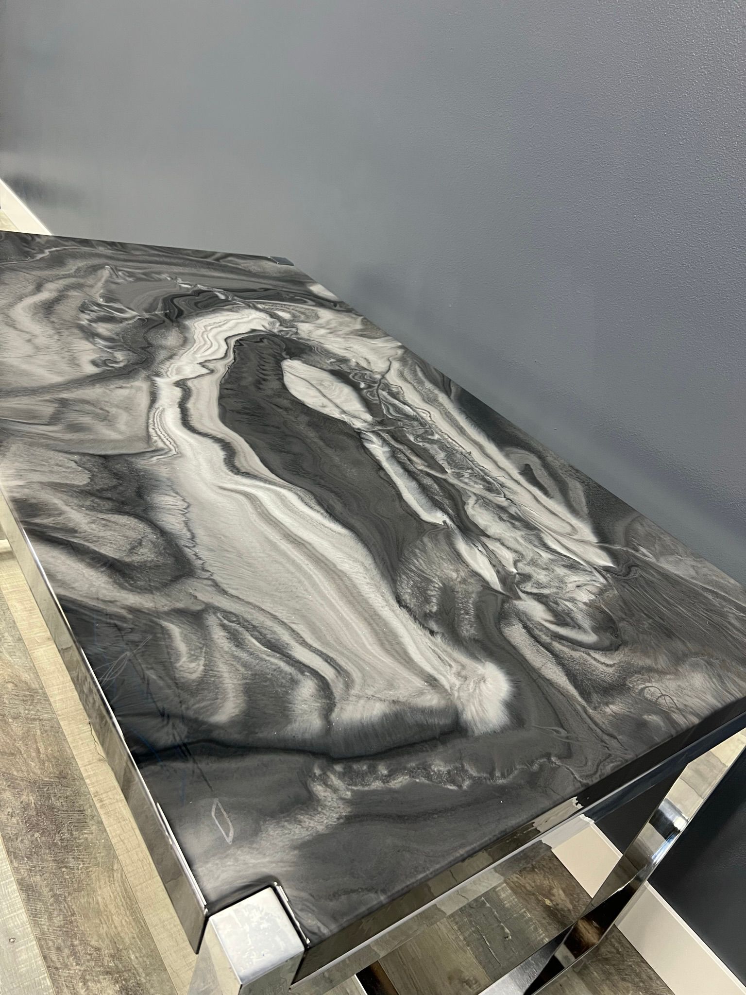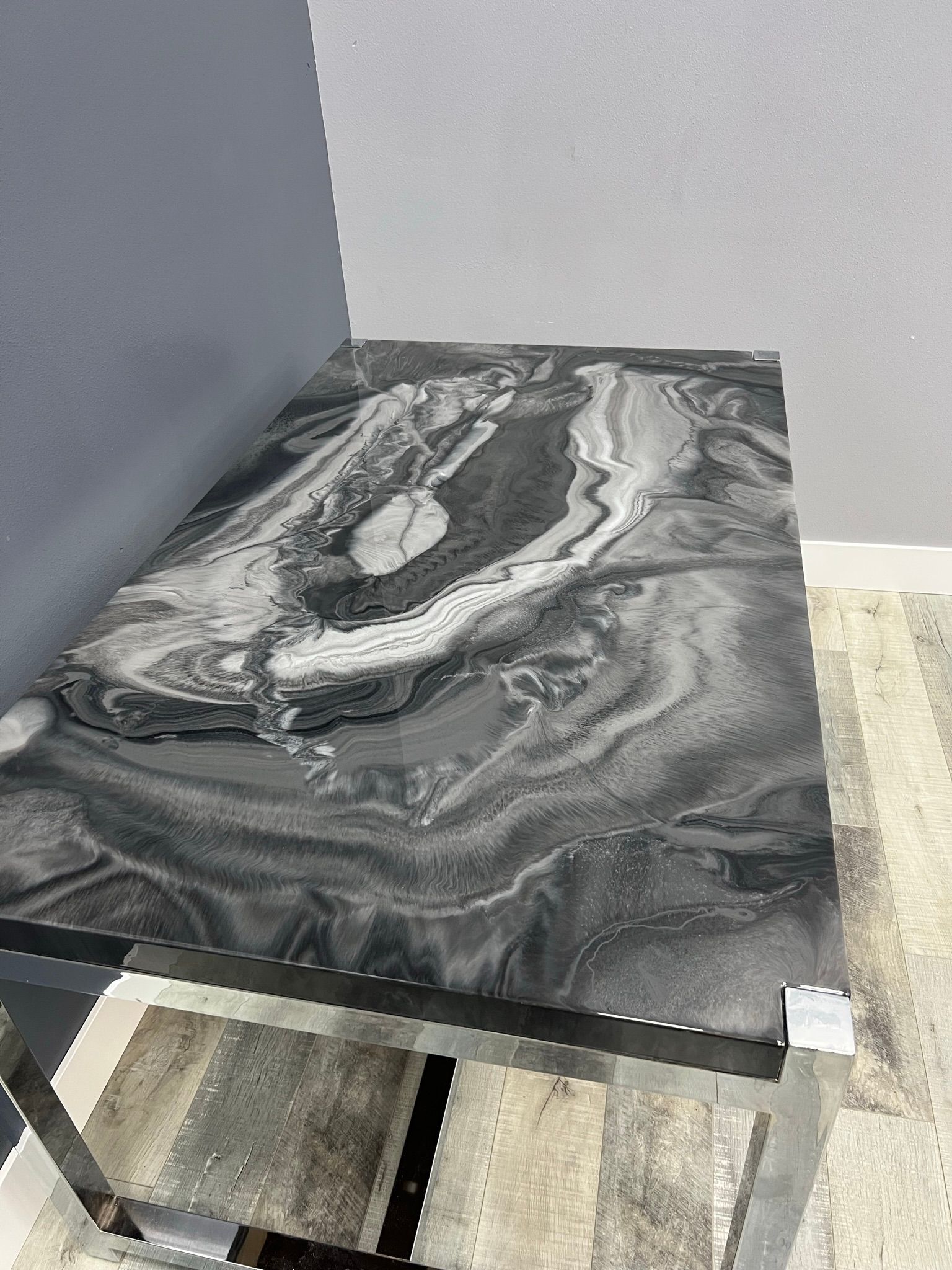 Epoxy countertops provide a glossy look that can make inexpensive materials like laminate or worn-out wood seem more luxurious. Consumers commonly place an epoxy countertop over laminate, wood, concrete, or ceramic that has become worn out. This creates a shiny, glossy finish and protects the surface underneath. You can completely customize the color and style of these types of surfaces, and they can be used as countertops, bathroom vanity tops, table tops and more!